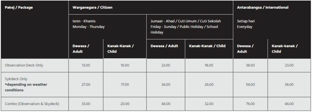 Berikut merupakan harga tiket dan pakej untuk rujukan anda: